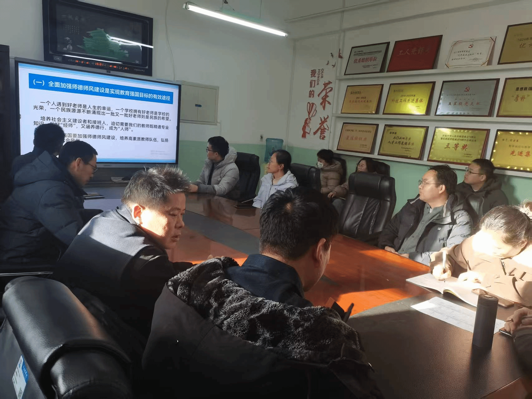 在学习环节,全体人员集中观看了师德教育专题片《加强师德师风建设 实现教育强国目标》。该片系统解读师德规范,并结合典型案例开展警示教育,强调严管教师队伍、夯实育人根基,为建设高水平应用型高校提供支撑。观看后,与会教师一致表示要以身作则、恪守师德,将立德树人根本任务融入教学科研全过程,努力培养更多高素质医药人才。